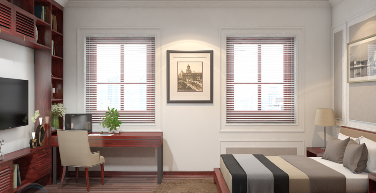 Một phòng ngủ khác thiết kế hướng ban công trước và sử dụng nhà vệ sinh chung, được thiết kế ngay bên cạnh, gần với khu tiểu cảnh và sảnh thang thông tầng.
